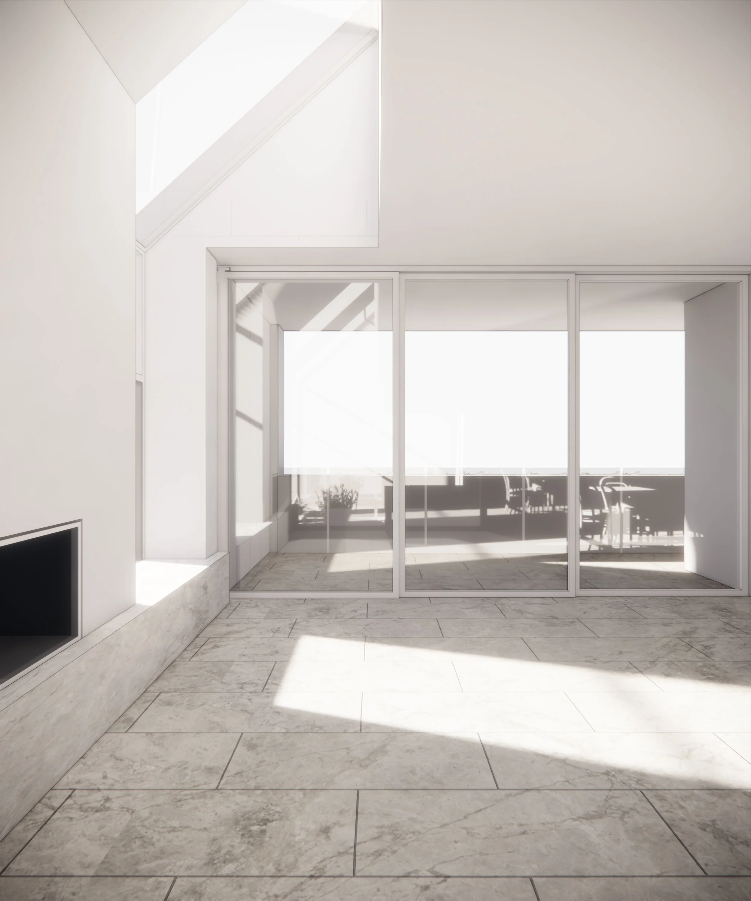 Windows and skylights are placed to create episodes, different experiences within the interior, by framing views of the gardens across the road, the tops of trees around the site, and the sky above.